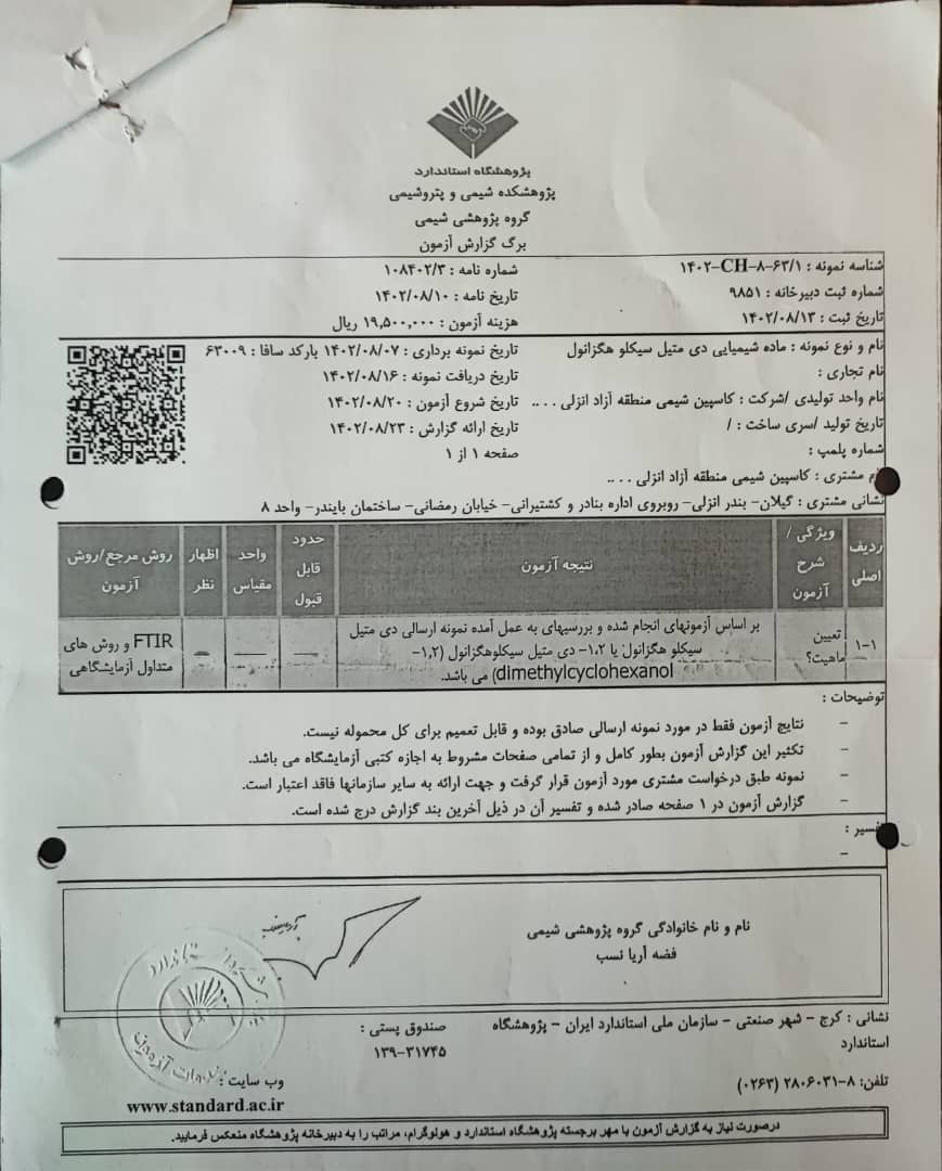 - حالت فیزیکی: معمولاً مایع روغنی شکل با بوی مشخص.